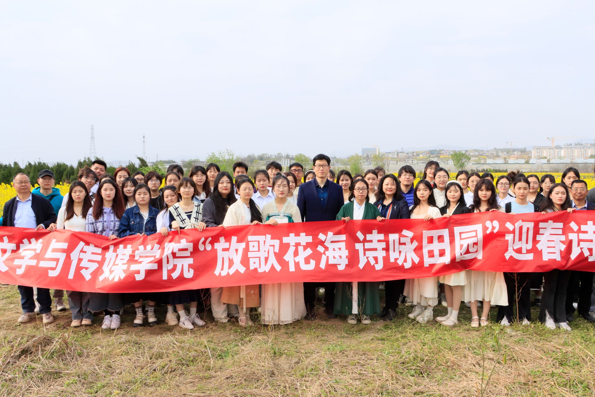 3月15日下午,pp电子网站在张滩镇黄洋河畔油菜花田顺利举办了2023年迎春诗会。学院党总支书记芦伟、副书记杨海蓉、郑继猛教授和安日辉、曹璇璇两名青年教师出席了本次活动。活动由辅导员邹棠华组织,影视戏剧社承办,pp电子网站近70名学生参加了本次诗会。
