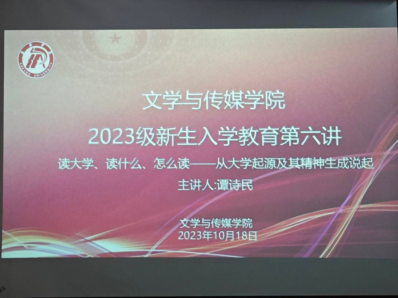 2023年10月18日晚,pp电子网站于江南校区大礼堂开展了新生入学教育第六讲,邀请pp电子网站秘书与新媒体系系主任谭诗民博士作了题为“读大学、读什么、怎么读——从大学起源及其精神谈起”的专题讲座。讲座由院党总支副书记杨海蓉主持,新生辅导员许明、李欣逸组织2023级全体新生到场聆听。