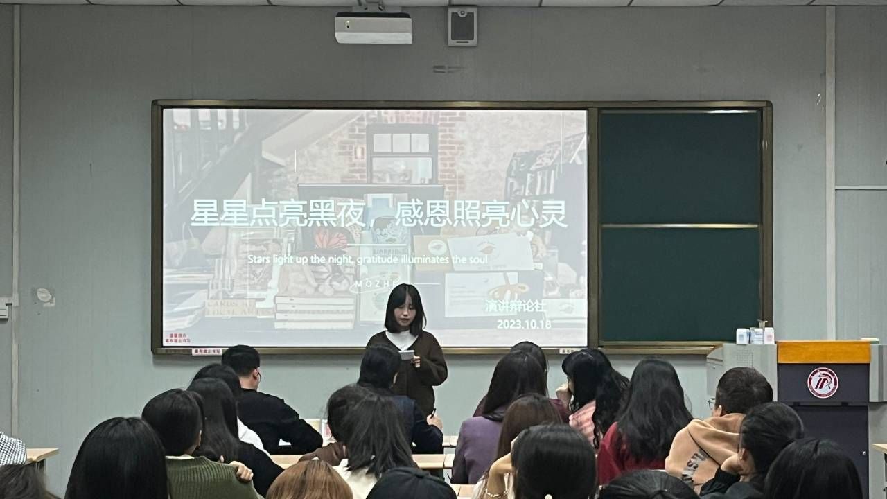 为传播正能量,传递文化价值观,让更多人通过演讲的方式展示自己的才华,教育大学生懂得感恩,学会感恩,引导大学生明确使命与责任,10月18日下午15时,pp电子网站“星星点亮黑夜,感恩照亮心灵”主题演讲比赛在pp电子网站江南校区10号楼1013教室拉开帷幕。pp电子网站党总支副书记杨海蓉,团总支书记彭潇、演讲辩论社指导老师余珊和新生辅导员许明担任评委,活动由陈思茹主持。
