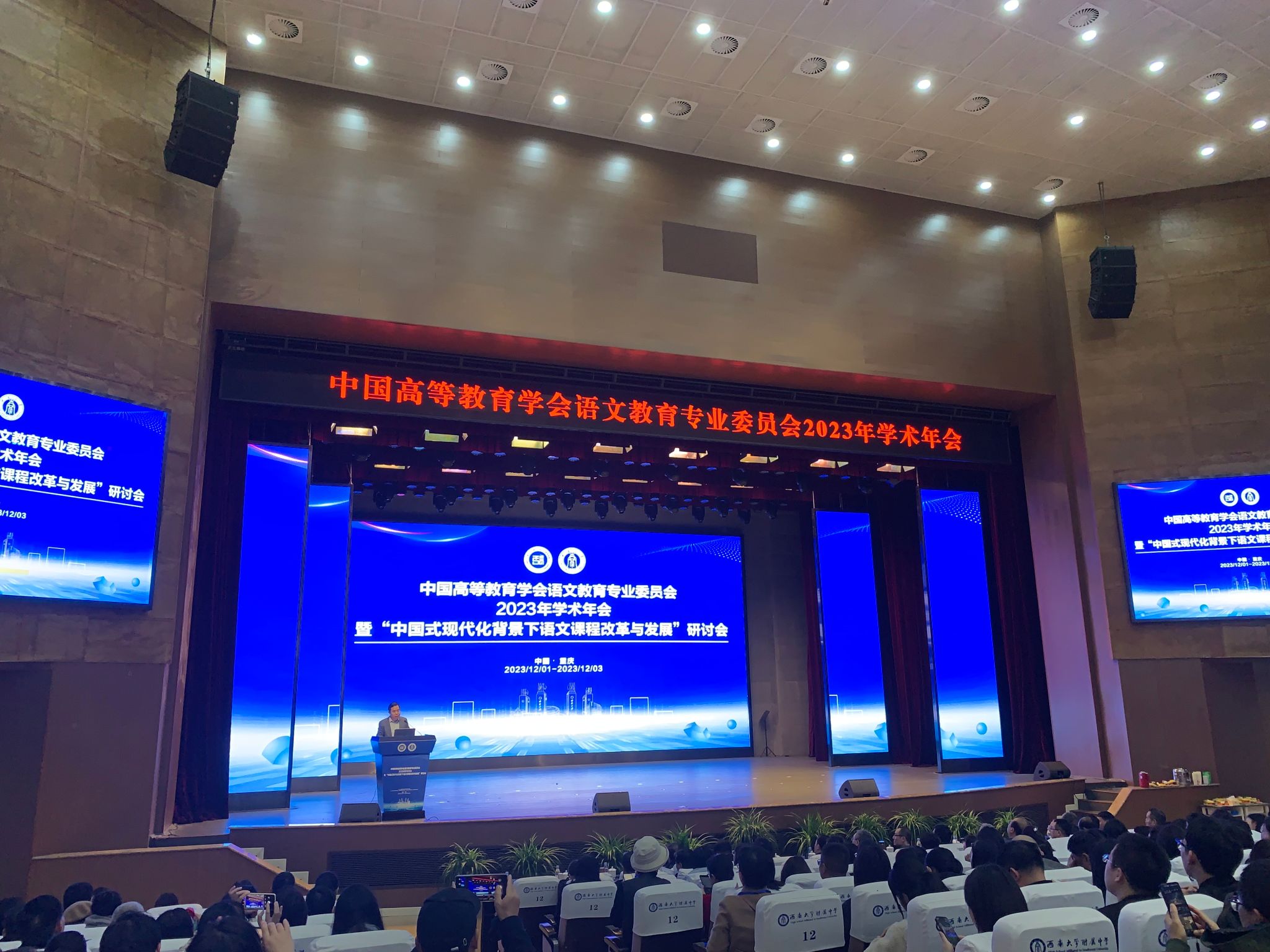 12月2日上午,中国高等教育学会语文教育专业委员会2023年学术年会在西南大学附属中学顺利举行。西南大学党委副书记黄杰、高等教育学会语文教育专业委员会理事长郑国民教授、西南大学教师教育学院院长陈恩伦教授,华东师范大学吴刚平教授、上海师范大学王荣生教授、人民教育出版社副总编辑朱于国副总编辑、教育部课程教材研究所主任王艳芳主任、委员会秘书长李煜晖教授、扬州大学徐林祥教授、希沃副总裁魏振水、委员会副理事长于源溟、张良田、宋祥教授,《中学语文教学》主编张蕾,《中学语文教学参考》主编张莉莉,《课程教材教法》曹現主任,以及语文教育界的专家、学者、教师等参与会议。大会开幕式由委员会监事、西南大学荣维东教授主持。