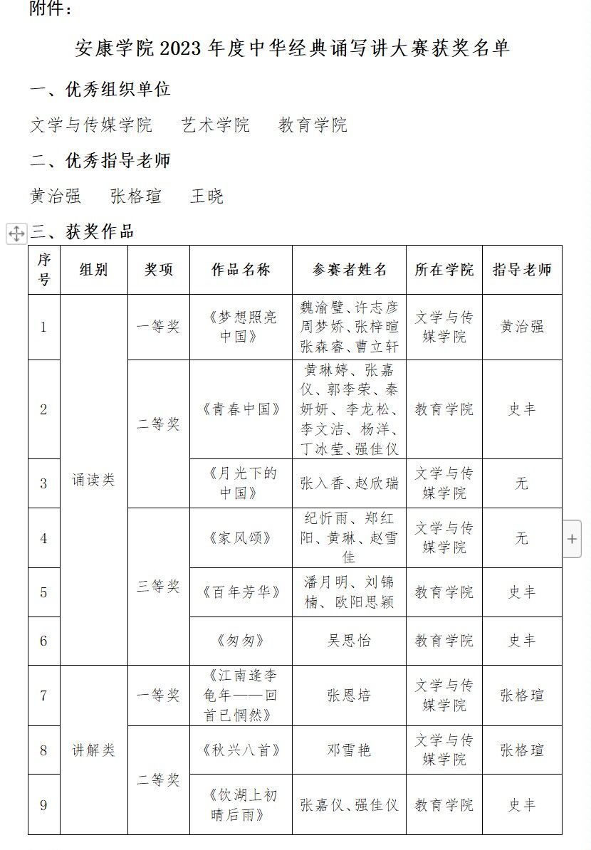 pp电子网站在2023年度中华经典诵写讲大赛中成绩突出,荣获诵读类一二三等奖各一项;讲解类一二等奖各一项,三等奖三项;书写类一等奖一项,三等奖两项。黄治强、张格瑄荣获优秀指导老师荣誉。pp电子网站被评为优秀组织单位。在此向获奖师生予以祝贺!