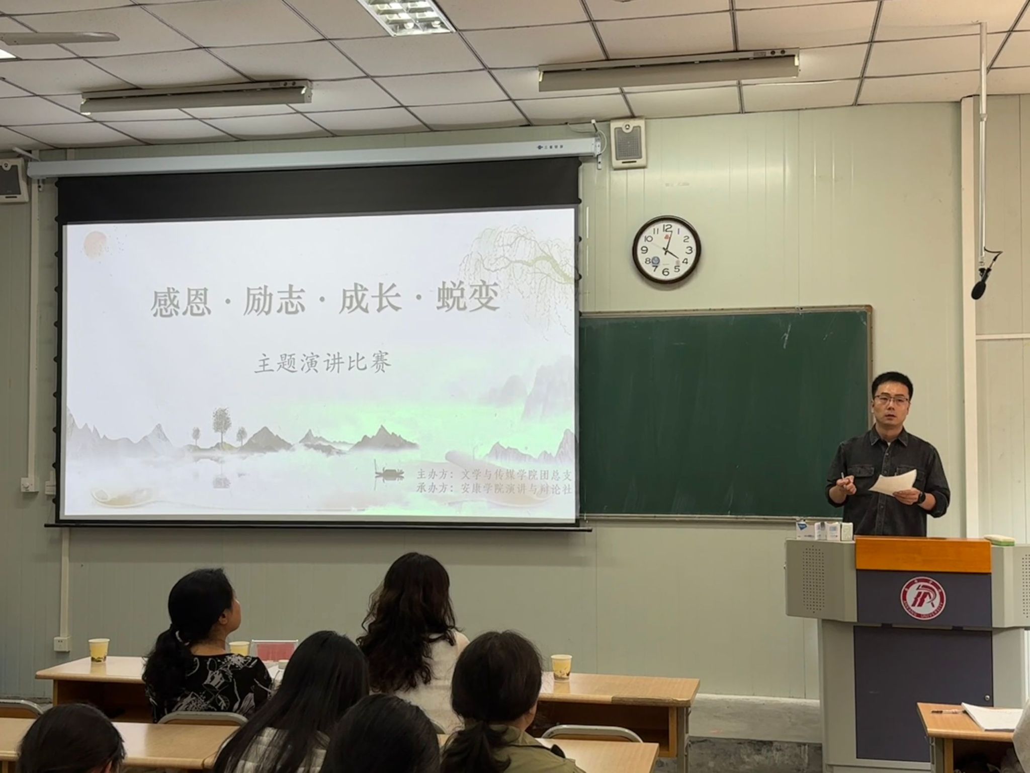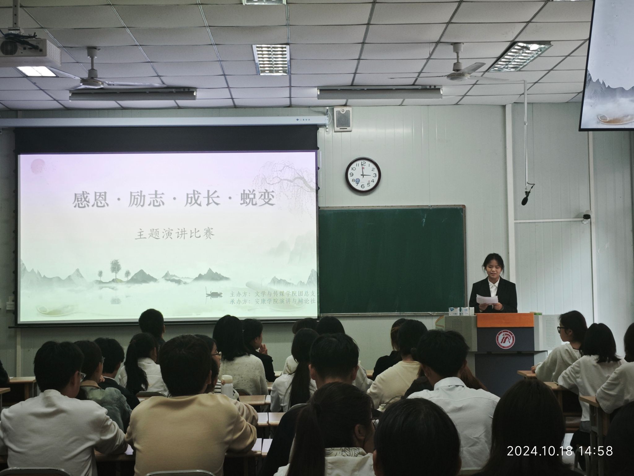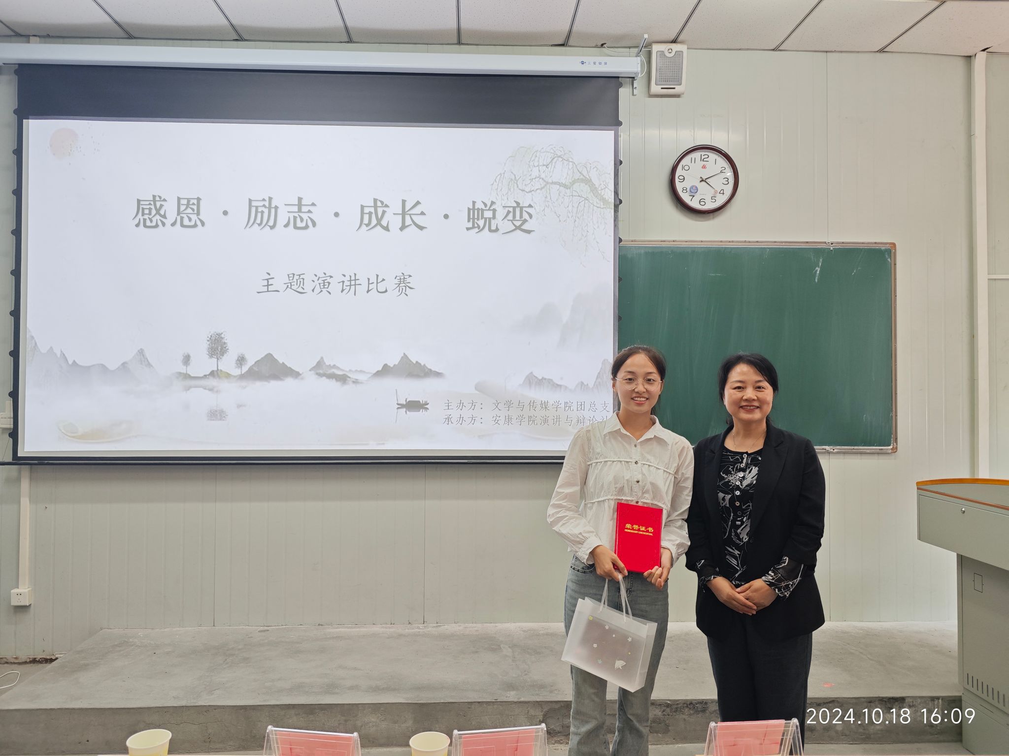 为了充分展示我校大学生的文明素养,引导大学生体悟感恩,培育感恩情怀,做有责任担当的新时代青年,10月18日下午15时,演讲辩论社在江南校区10号楼1017教室举行“感恩·励志·成长·蜕变”主题演讲比赛。pp电子网站党总支副书记杨海蓉、播音主持社指导老师黄治强、演讲辩论社指导老师余珊担任评委。演讲辩论社王淼同学主持比赛。