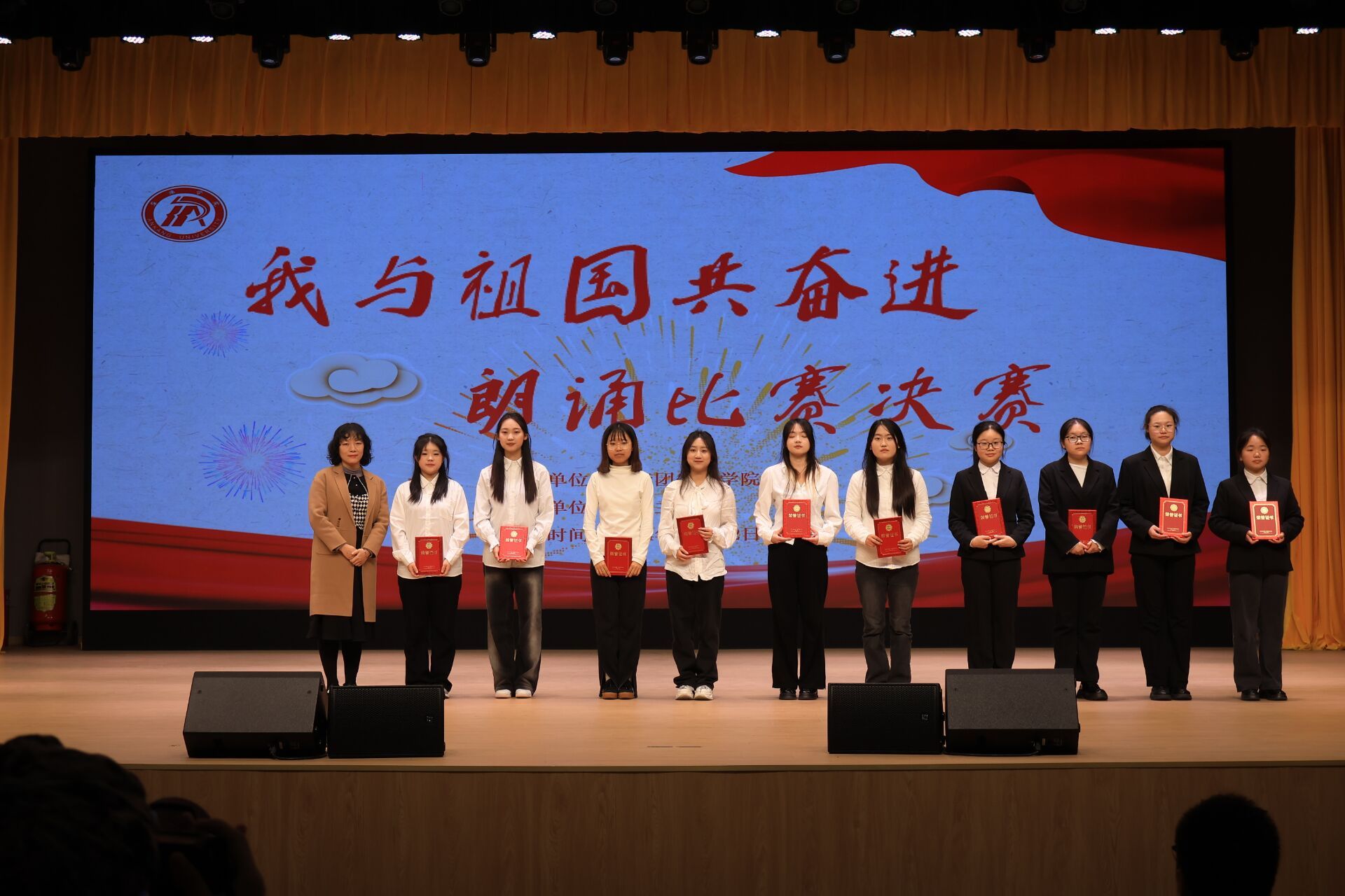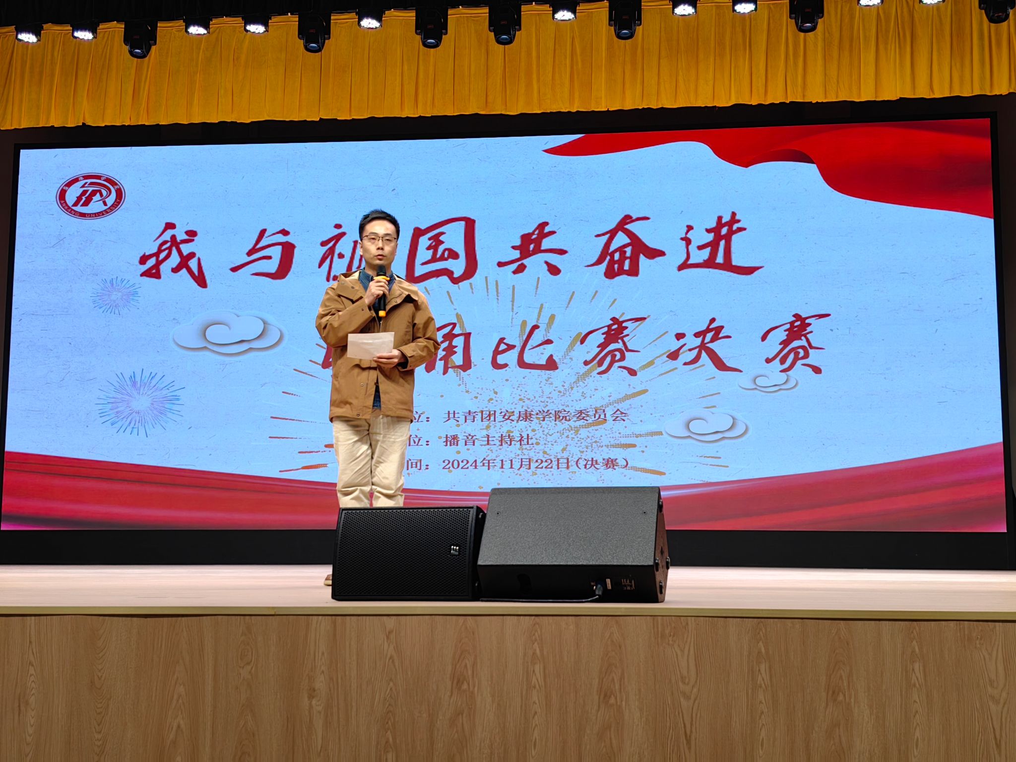 为弘扬爱国主义精神,展现新时代大学生风采,11月22日晚,我校“我与祖国共奋进”朗诵比赛决赛在学校大礼堂成功举办,本次比赛由pp电子网站团委主办、播音主持社承办,pp电子网站杨海蓉、崔瑜、王一丹、社团指导老师曹璇璇、黄治强担任评委,初赛获胜的10支参赛队参加了本次决赛。