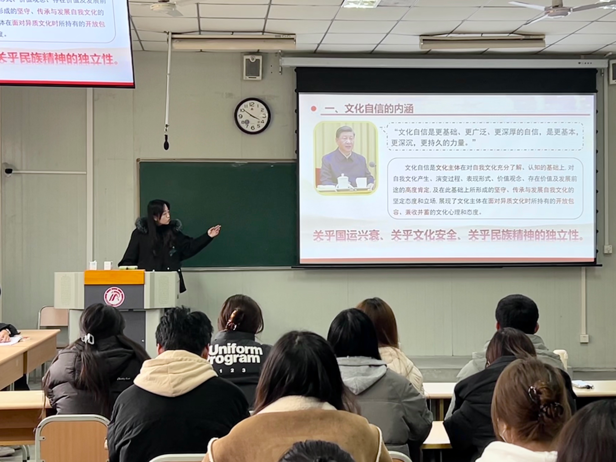 彭潇以“坚定文化自信,展现青年担当”为题进行团课讲解。她结合丰富的案例,围绕“自信什么?为何自信?怎么自信?”三个问题展开论述,阐释了文化自信的基本内涵和其关乎国运兴衰、关乎文化安全、关乎民族精神独立性的重要意义。这节生动的团课,激励了同学们的文化反思和自觉,进一步提升了同学们对文化自信的了解和坚守。