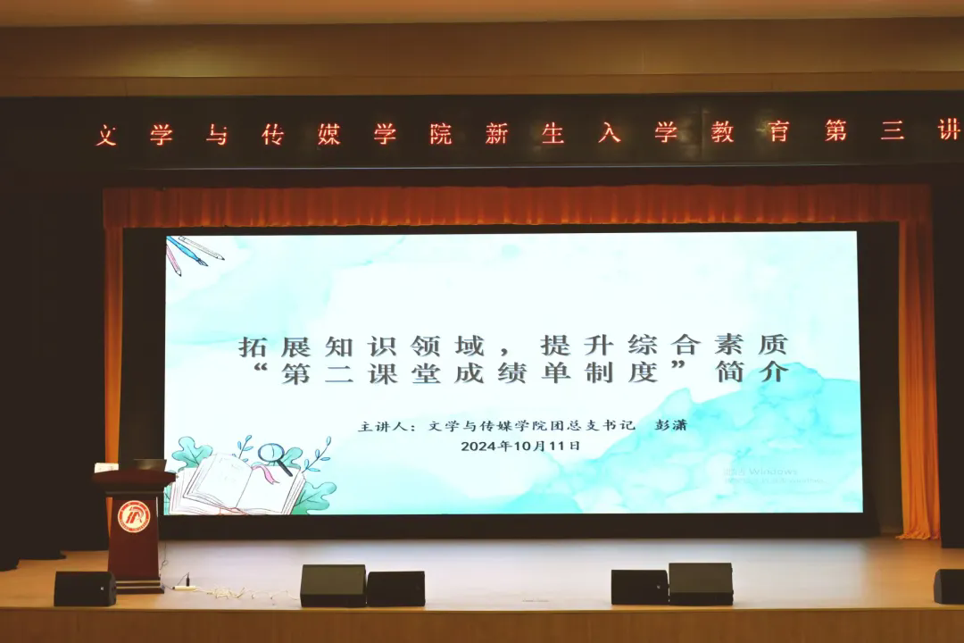 为全面提高新生综合素质,以完备、科学的“第二课堂成绩单”制度体系提升第二课堂育人实效,2024年10月11日下午,pp电子网站在江南校区大礼堂开展新生入学教育第三讲:拓展知识领域,提升综合素质——“第二课堂成绩单制度”简介。pp电子官网团总支书记彭潇主讲,辅导员喻言、刘言军和2024级全体同学参加,会议由刘言军主持。