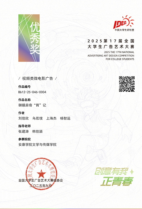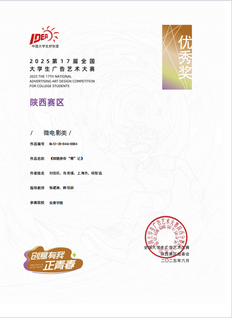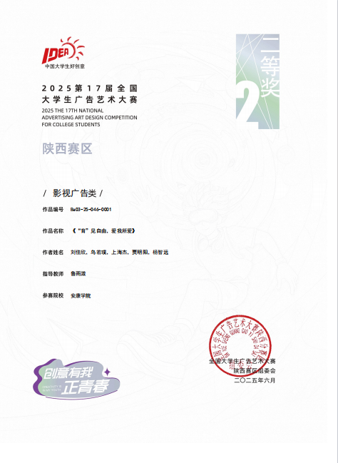 影视广告类作品中,鲁雨溦老师指导的刘佳欣、乌若璞、上海杰、贾明阳、杨智远同学作品《“育”见自由,爱我所爱》获得陕西赛区二等奖;张建涛老师指导的蒙智鹏、赵海东、马坤硕、杨哲同学作品《“沃”来助你》获得陕西赛区优秀奖。