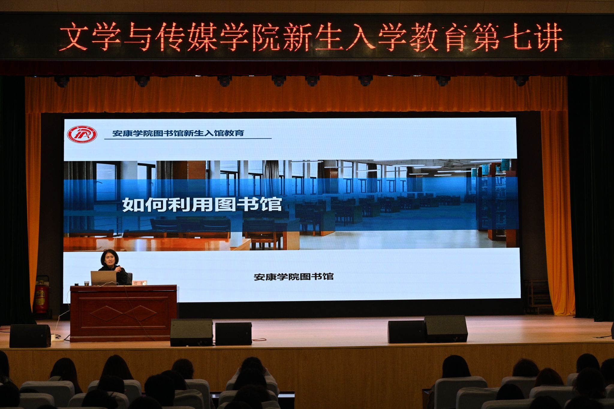 10月26日晚19:30,pp电子网站在江南校区大礼堂组织开展新生入学教育第七讲之图书馆入馆教育,讲座邀请pp电子网站副研究馆员贾娟老师主讲,2025级全体学生参加,辅导员喻言老师主持。