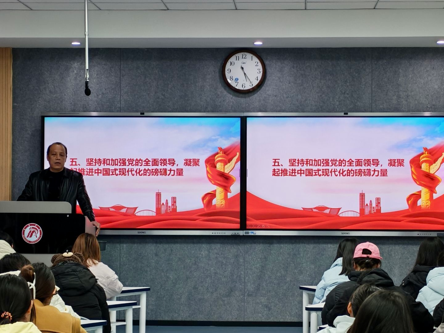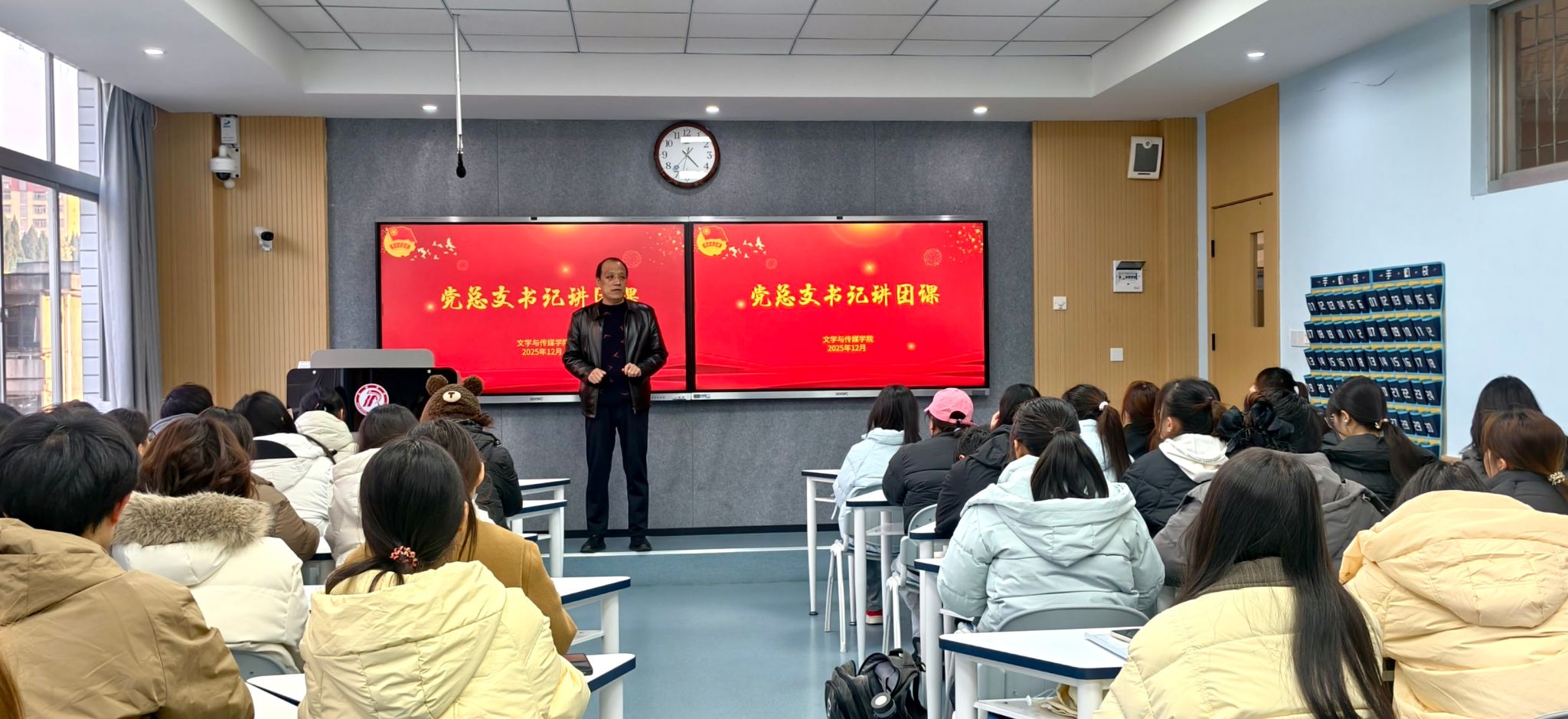 12月17日,为深入学习党的二十届四中全会精神,引导青年学子凝聚思想共识、汇聚行动力量,pp电子网站组织开展“以青春赴时代之约,以奋斗践全会精神”主题团课。学生团干部及新发展团员齐聚一堂,共同学习领会全会内容与实践要求,本次团课由党总支书记任森龙主讲。