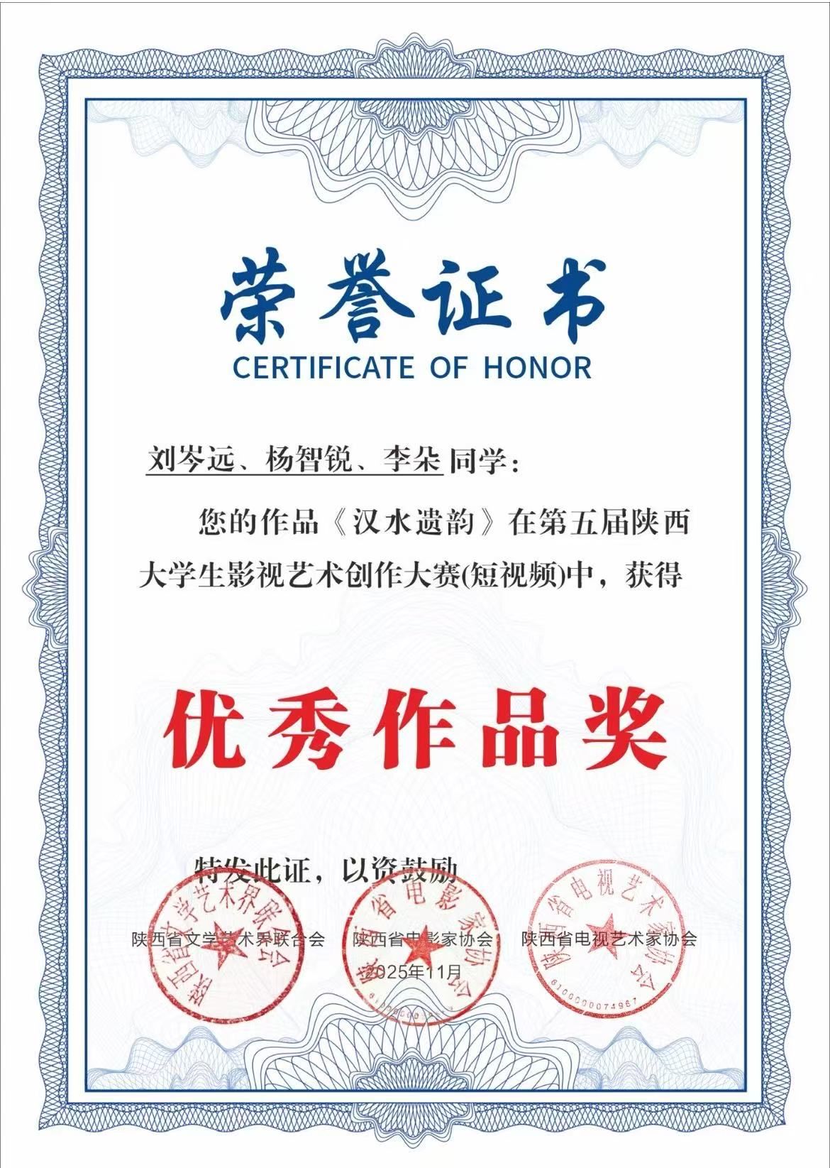 近日,由陕西省文学艺术界联合会、陕西省电影家协会、陕西省电视艺术家协会联合主办的第五届陕西大学生影视艺术创作大赛评选结果正式揭晓,pp电子官网网络与新媒体专业学生刘岑远、杨智锐、李朵在崔瑜老师指导下创作的非遗题材短视频作品《汉水遗韵》荣获优秀作品奖。