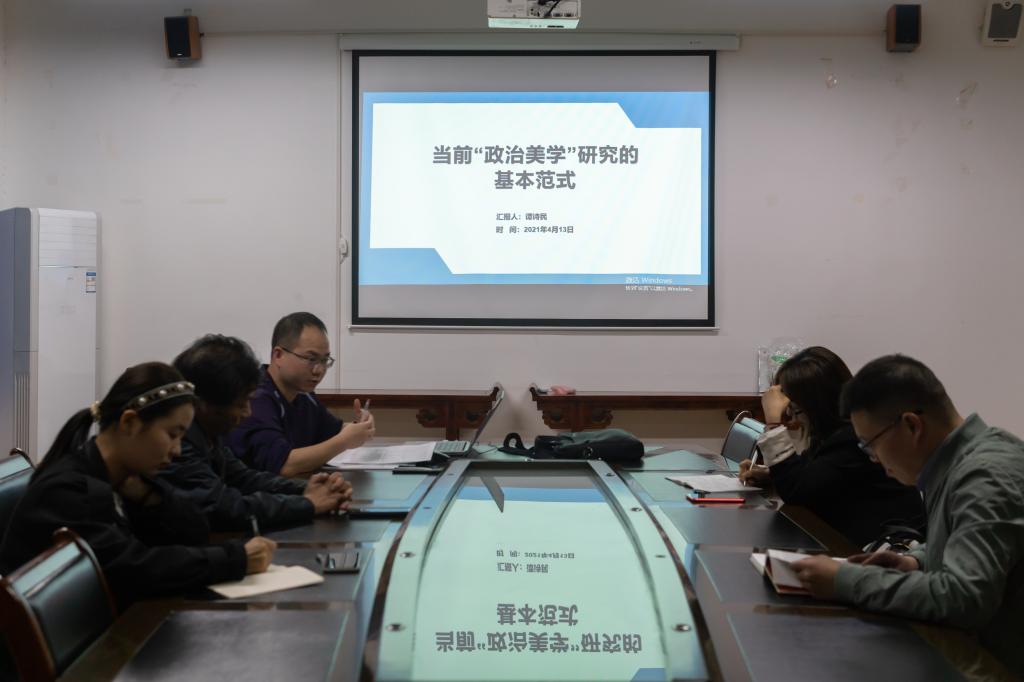 谭诗民老师首先介绍了“政治美学”的术语发展和基本内涵,梳理了国内外学界关于此一论题的研究成果和研究趋势,概括了关于此一论题的几种主要范式。他指出,当前“政治美学”研究呈现出跨学科渗透和深度介入多学科的特性,体现出本体阐释和方法论思考的特性。与会老师对此一问题进行了热烈讨论,指出关于“政治美学”问题的专门研究时间不长,但对此一问题的关注由来已久,其最终要回到对人的存在、人类社会美好制度和幸福生活的关注和思考上来。