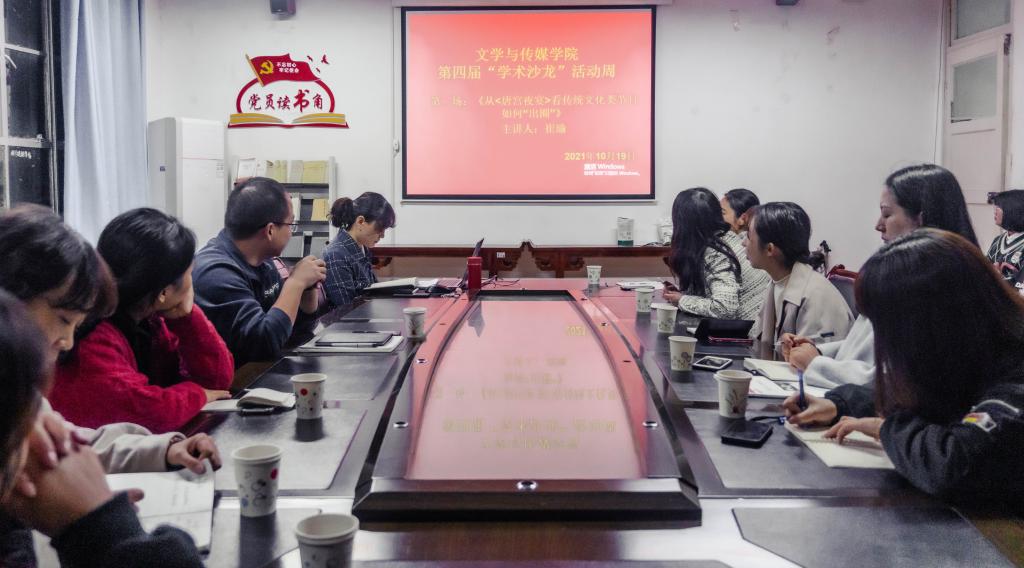 1019日晚19点,秘书与新媒体学科组在2307会议室,举办了第四届“学术沙龙”活动周第二场沙龙活动。本场沙龙由崔瑜老师主讲,主题是“从《唐宫夜宴》看传统文化类节目如何出圈”。学科组谭诗民、王薇薇、王一丹、刘锦、罗相如、锁玉洁、谭志轩,以及汉滨高中李爱霞等老师和部分学生参加了活动和研讨。