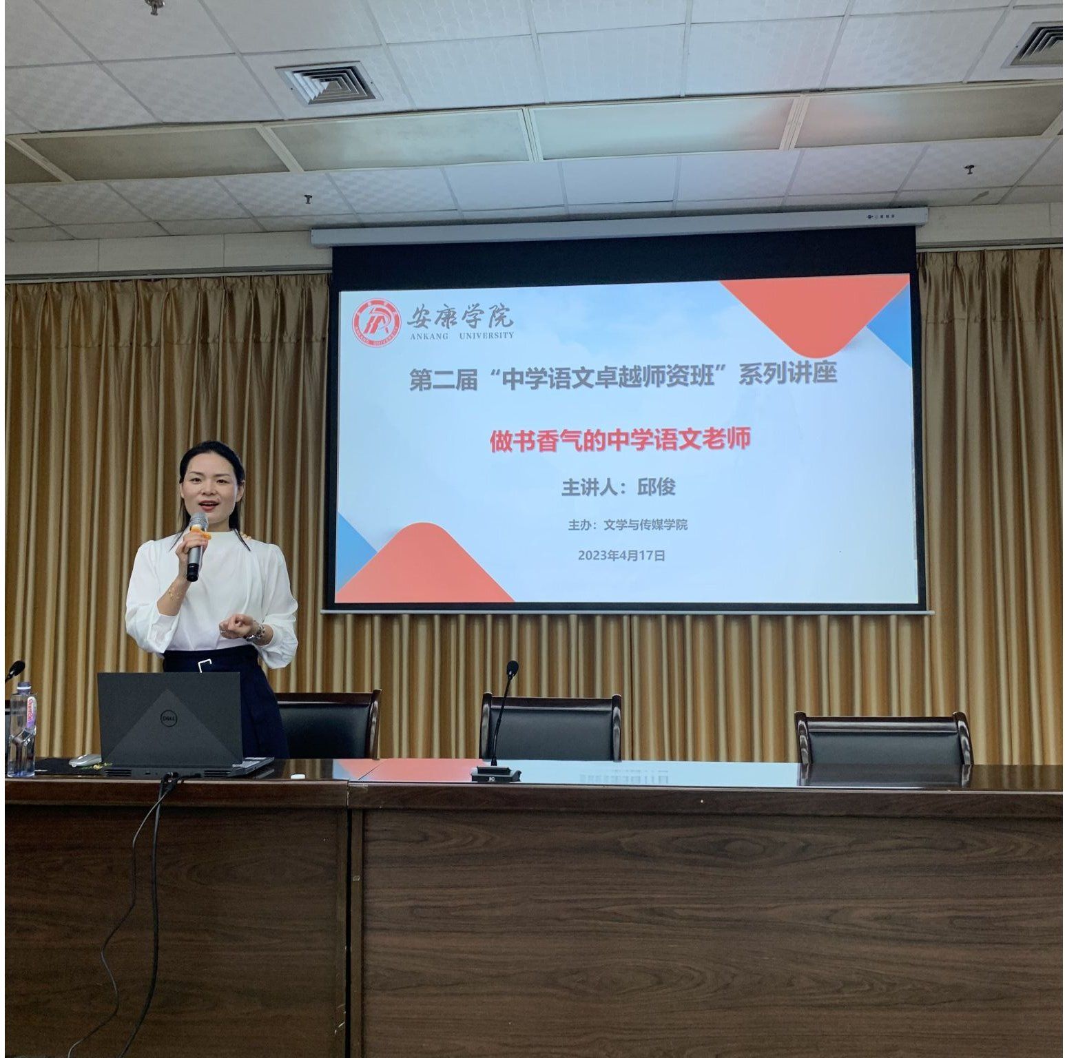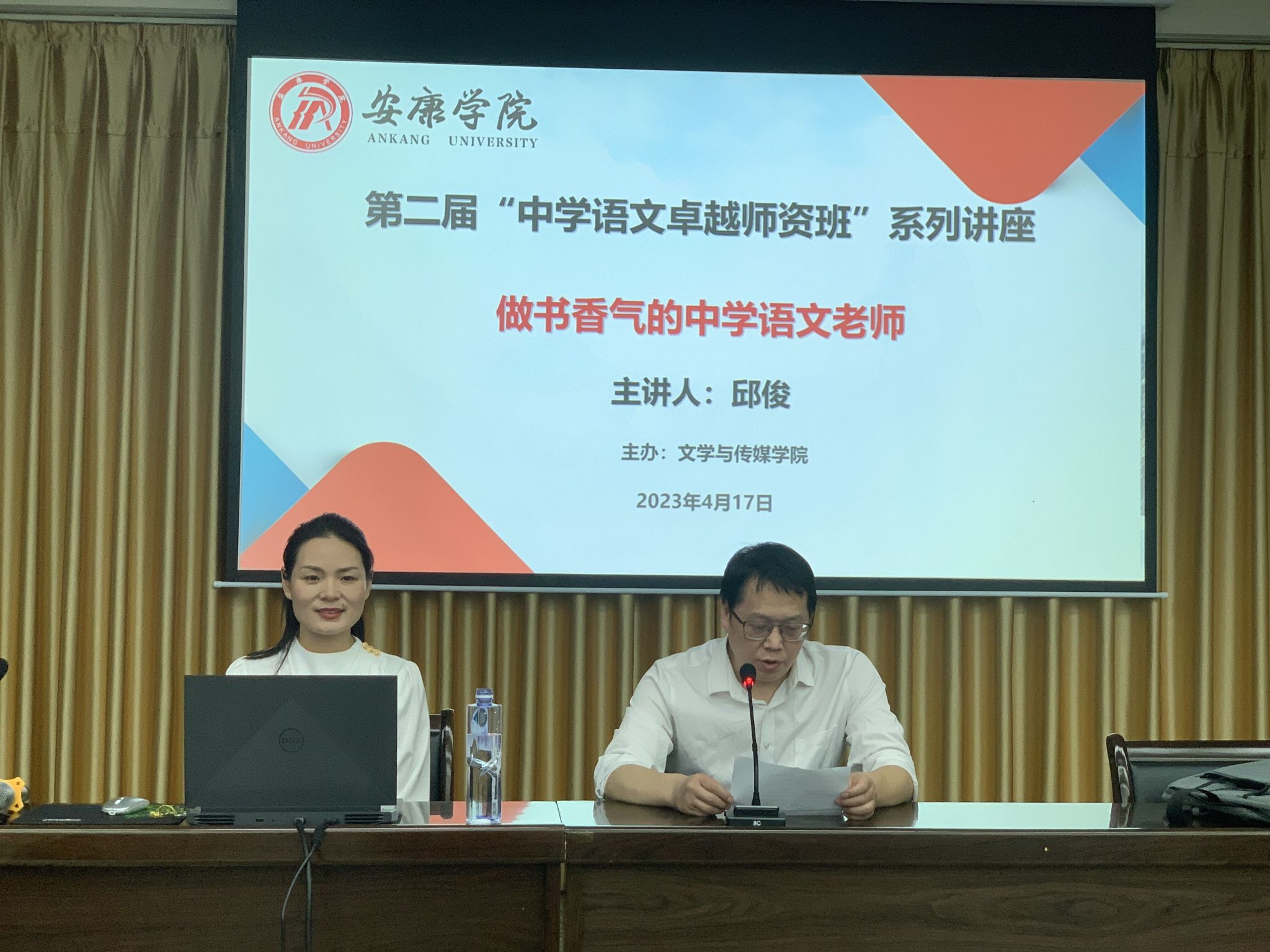 2023年4月17日下午七点半,陕西省教学名师、安康市教研室专家邱俊老师应邀为pp电子官网第二届“中学语文卓越师资班”系列讲座做了题为“做书香气的中学语文老师”的首场讲座。讲座由pp电子网站副院长朱云主持,班主任张格瑄和“中学语文卓越师资班”的135名同学聆听了本场讲座。