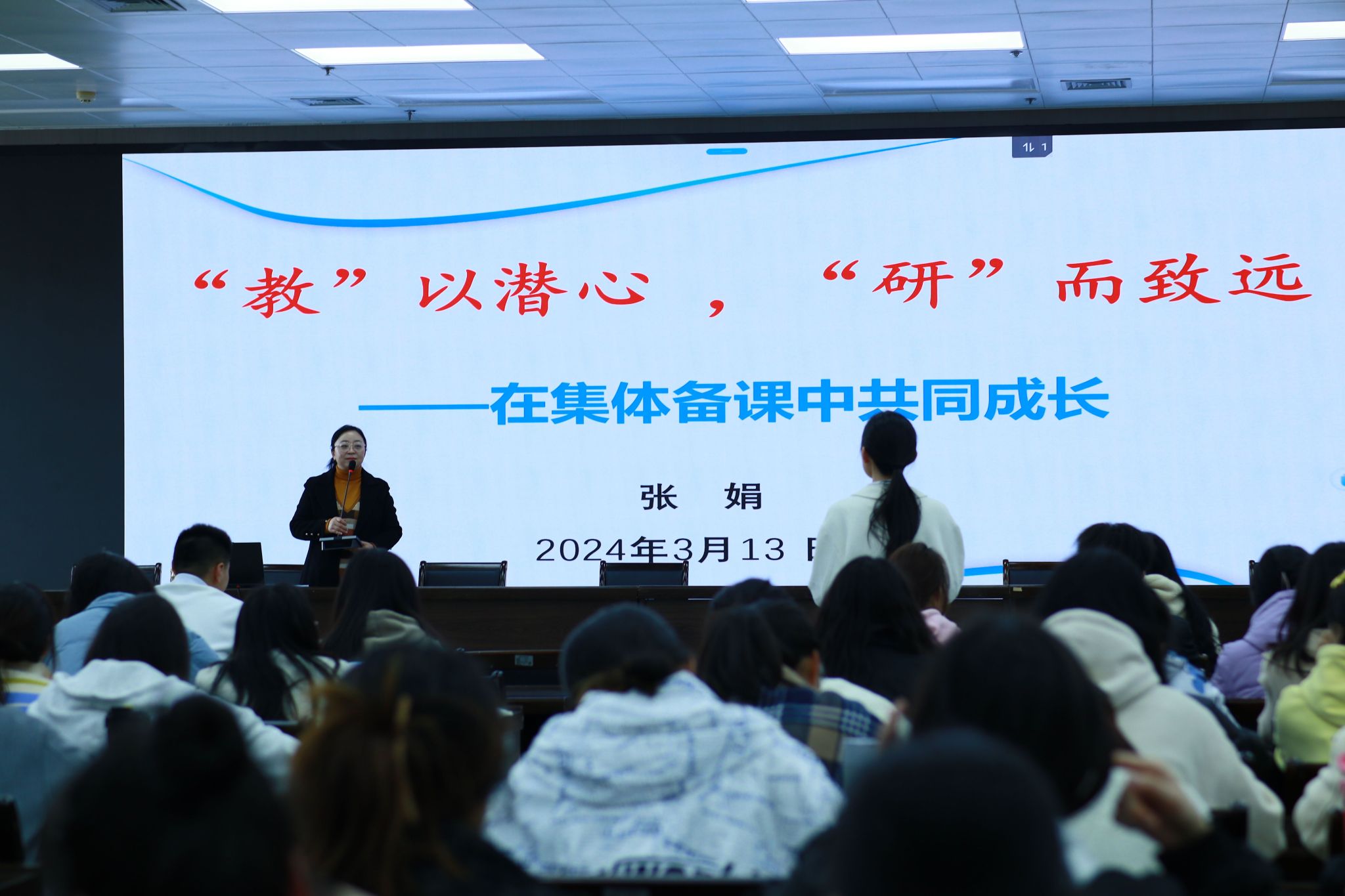 张老师就“集体备课”这个主题,从为什么要进行集体备课、集体备课备什么、怎样进行集体备课、如何备好一节课”四个方面分别展开讲解。首先,强调教研活动中集体备课重要性——将一个人的智慧变成一群人的智慧。张老师告诉同学们培养自我的资源意识与合作意识,促进自我的专业发展。随后,张老师就“如何备好一节课”,提出了三个要点和三个关注,要重视素读、裸备、写详案;关注文本、关注学生、关注教材,告诉同学们潜心教学,方能致远。最后,张老师用“知之愈明,行之愈笃”与同学们共勉。