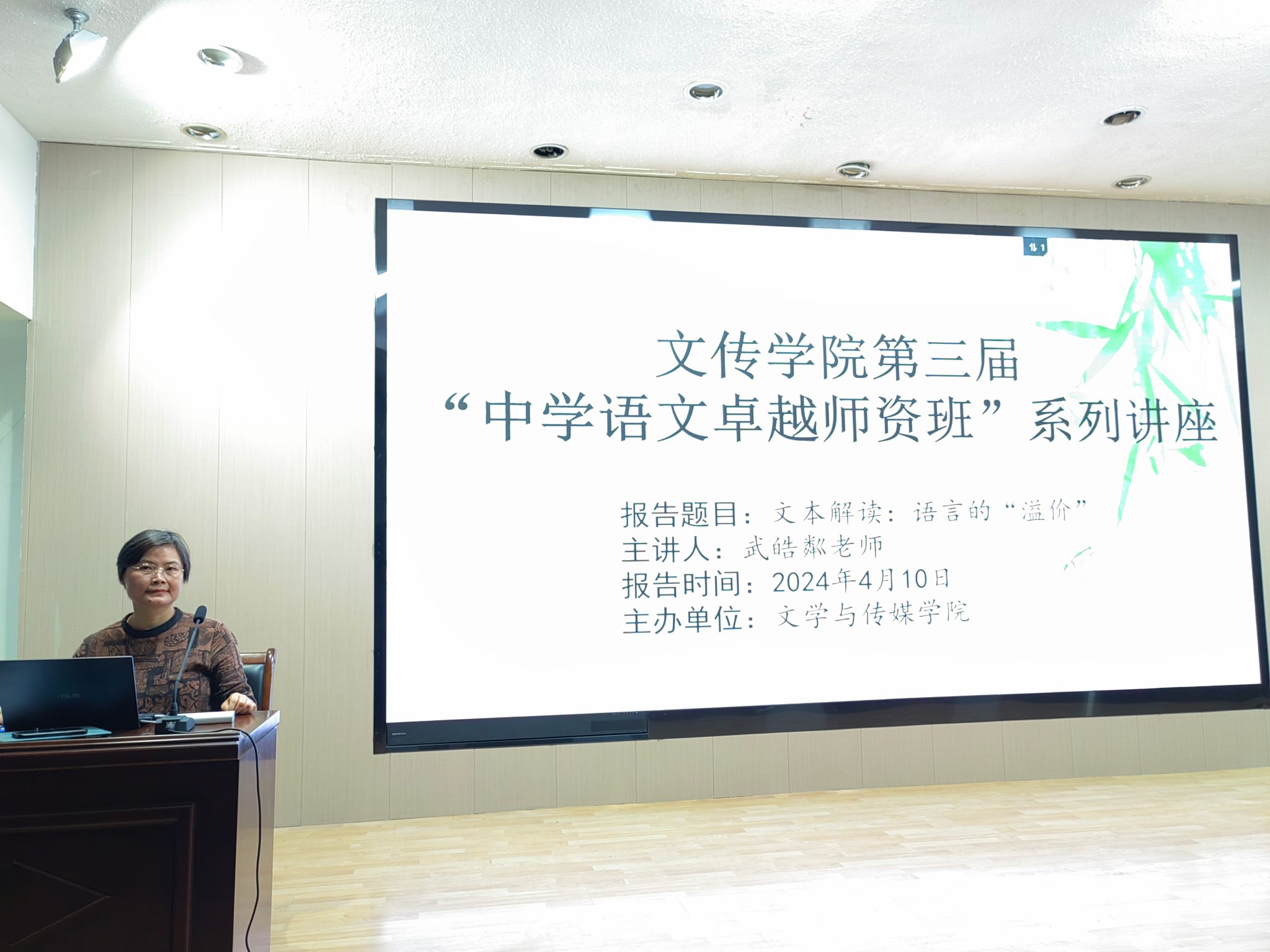 2024年4月10日下午两点半,pp电子网站特邀安康中学高级教师武皓粼老师,在一号教学楼报告厅为第三届“中学语文卓越师资班”全体同学做:“文本解读:语言的‘溢价’”专题讲座。班主任唐明珍和“中学语文卓越师资班”全体学生聆听了本场讲座。