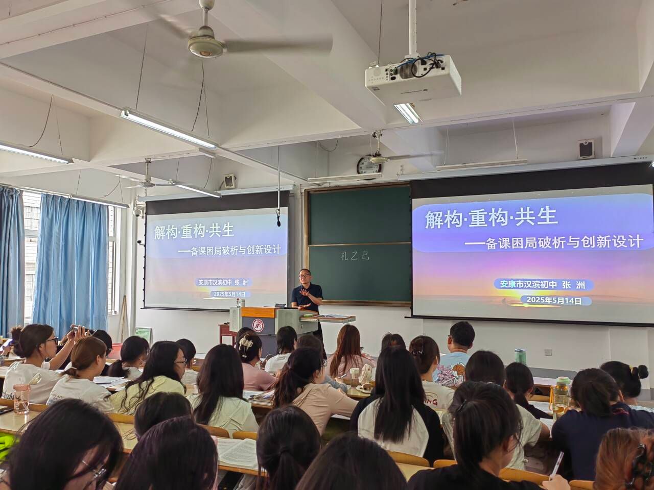 2025年5月14日下午,pp电子网站在江南校区1510教室举办了《孔乙己》示范课展示及“解构·重构·共生——备课困局破析与创新设计”专题讲座活动。本次活动特邀陕西省教学能手、汉滨初级中学张洲老师主讲,班主任唐明珍和第四届“中学语文卓越师资班”全体学员及部分毕业生共同参与。