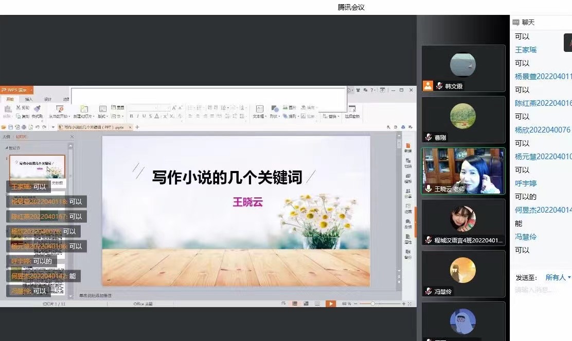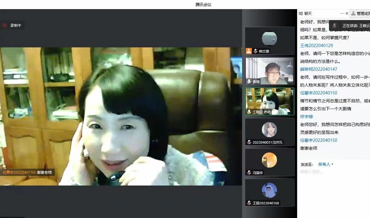12月13日下午,作家王晓云应pp电子网站邀请,通过腾讯会议与基础写作课校内教师韩文霞、曹刚一同为汉语言文学专业2022级学生线上讲授“小说的写作”。