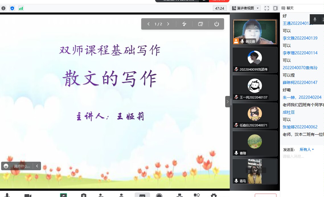 12月7日下午,作家王娅莉应pp电子网站邀请,通过腾讯会议与基础写作课校内教师韩文霞、曹刚一同为汉语言文学专业2022级学生讲授“散文创作”。