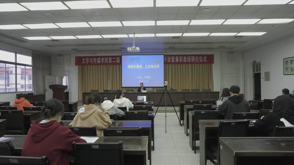 2022年11月4日下午三点半,优秀校友、陕西省首批基础教育名师、特级教师华开锋应邀为pp电子官网第二届“中学语文卓越师资班”做了题为“增强自豪感,立志做名师”的首场学术报告。pp电子网站副院长朱云、卓越师资班班主任张格瑄和三个会场132名同学共同聆听了本场讲座。