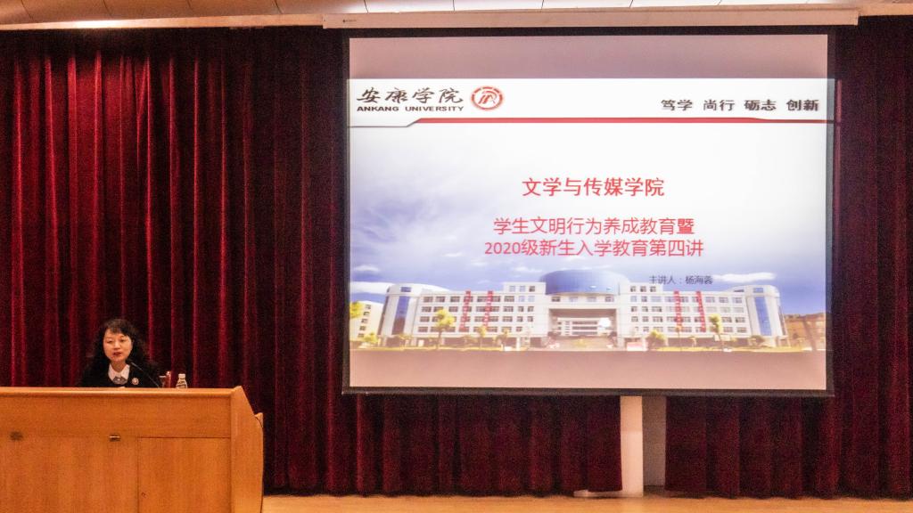 为引导2020级新生养成良好的文明行为习惯,规范大学生的日常行为,全面提高学生的综合素质,pp电子网站于2020年11月3日晚7:30在一号教学楼六楼报告厅举行了2020级新生入学系列教育第四讲:大学生文明行为养成教育,院党总支副书记杨海蓉担任主讲嘉宾。