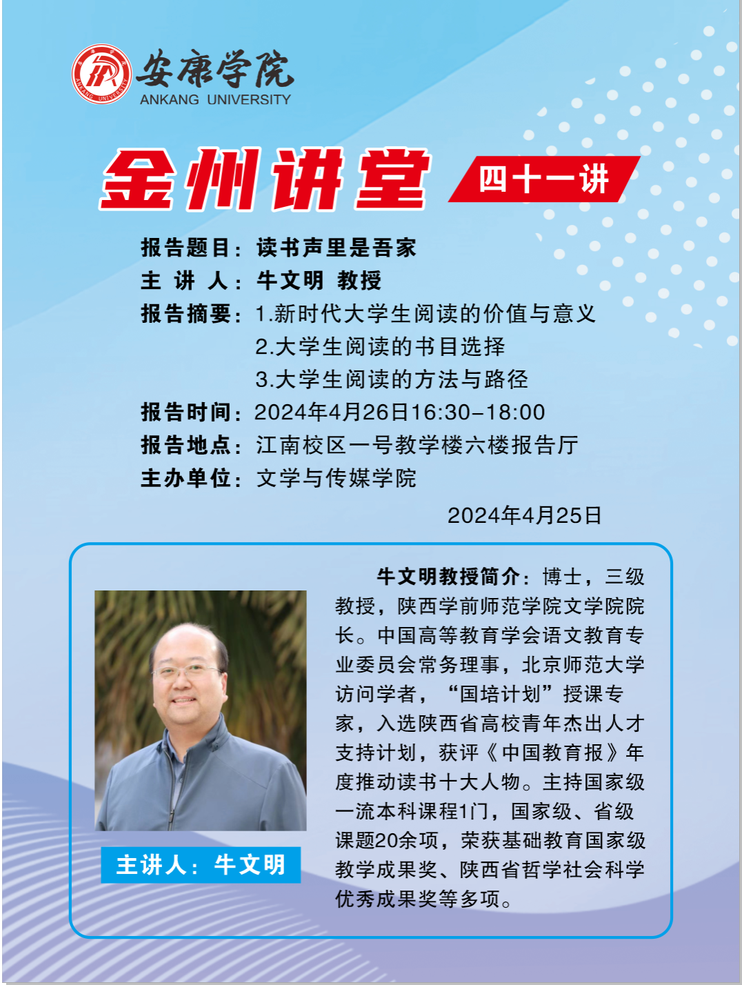 导航痕迹 首页 > 新闻通知 > 通知公告 > 正文 学院新闻 通知公告 金州讲堂四十一讲 主讲人:牛文明(陕西学前师范学院文学院院长) 发布人:pp电子网站 发布日期:2024年04月24日 阅读次数: